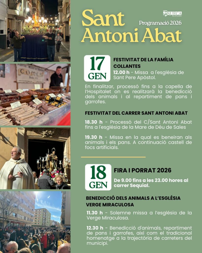La programació arrancarà este dissabte 17 de gener, mantenint viva la tradició impulsada històricament per la família Collantes. El punt de partida serà l’església de Sant Pere Apòstol, on a les 12.00 hores s’oficiarà una missa solemne cantada. Tot seguit, la imatge del sant recorrerà en processó els carrers fins a la capella de l’Hospitalet. Serà en este punt on es viurà un dels moments més esperats: la benedicció dels animals i el tradicional repartiment de pans i garrofes entre els assistents.